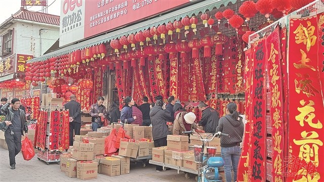 昨天,记者在市区新春阛阓看到,琳琅满成见年货摆满摊位,销售迎春饰品的摊位挂满红色的对子和灯笼,飘溢着浓浓的节日气味。